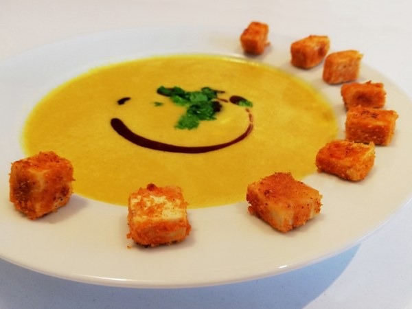 NASVET: Takšno bučno juho lahko naredimo tudi s popečenim tofujem! Lečo preprosto zamenjamo za 1 zavitek tofuja. Polovico tofuja kuhamo skupaj z ostalimi sestavinami, drugo polovico pa najprej posujemo s kajenskim poprom, soljo, ter na hitro popečemo. Popečen tofu nato na koncu postrežemo skupaj s končano juho. Za lažjo predstavo pa prilagamo še slikico bučne juhe s tofujem.