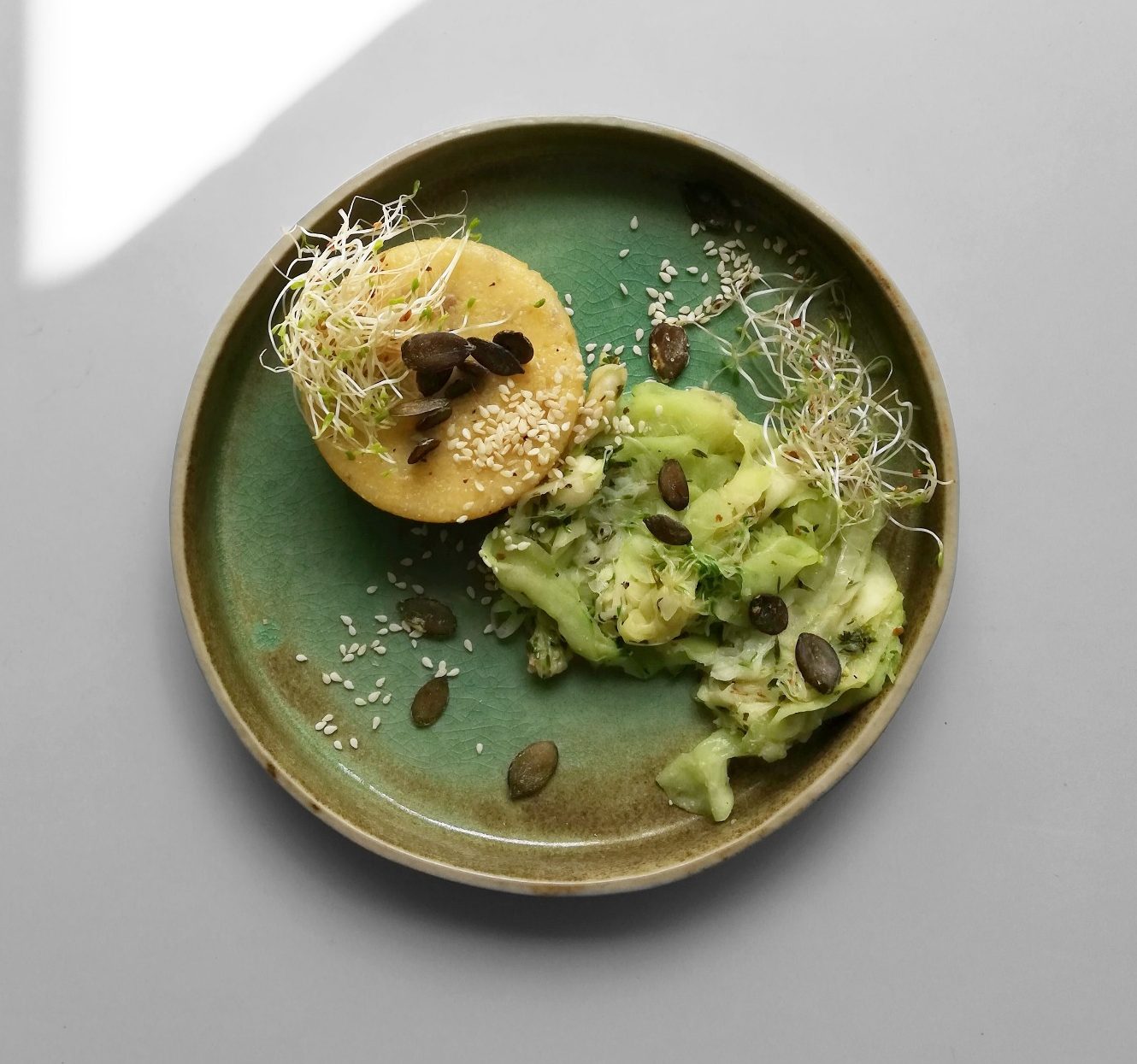 Ko je polenta ohlajena, se lepo izlušči iz modelčka. Serviramo skupaj s kumarčno omako in potresemo z semeni in sezamom.