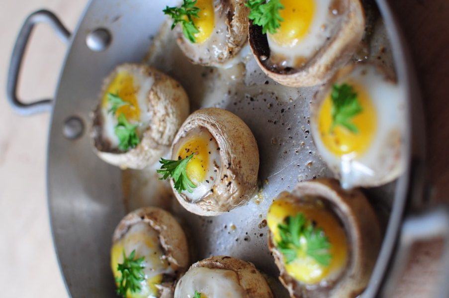 V manjši pekač, obložen z peki papirjem previdno zložimo šampinjone ter jih nadevamo s pripravljenim nadevom, a ne do vrha! Prepeličje jajce vsako posebej ubijemo in zlijemo na nadev.